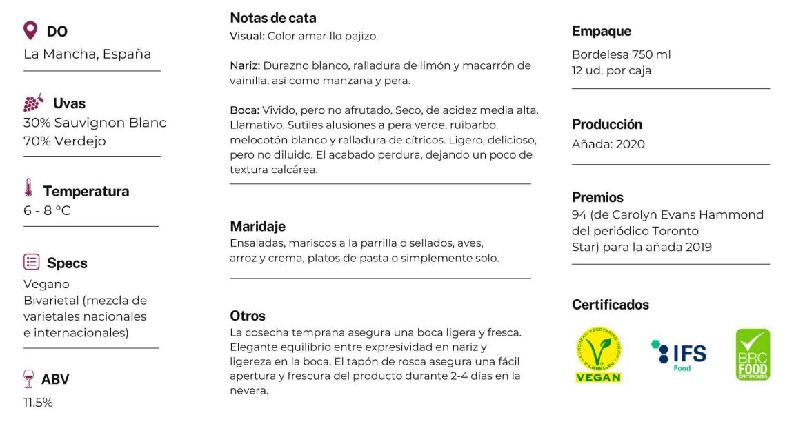 VINIFICATION: Verdejo and Sauvignon Blanc grapes are carefully selected and harvested from the coolest high-altitude vines. The fermentation is conducted between 15-17°C during 10-12 days. The wines are then kept in stainless steel tanks until they are ready for bottling.